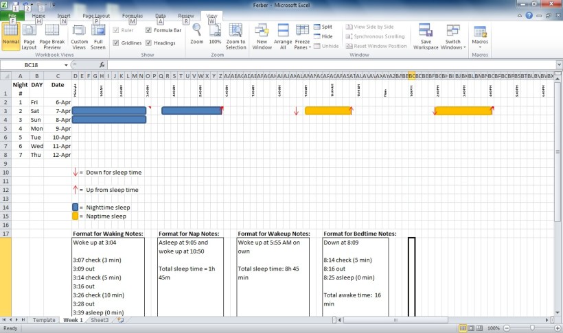PS – I love the Ferber process SO much that I created a spreadsheet to track our nights so we can watch the trend.