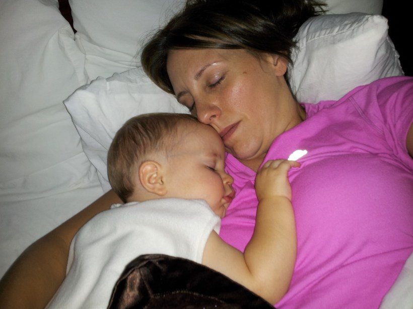 Snuggling in a hotel room. Poor baby couldn’t sleep on his own – he was terrified in this strange room without Mom or Dad. So I took one for the team… And am loving it!