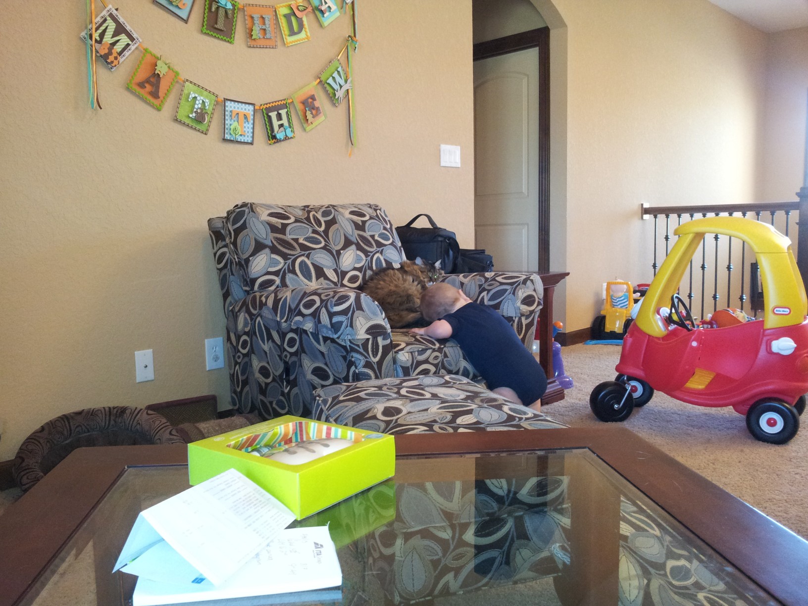 We then came home and decided to go for another wagon ride and were hoping to chat with our new neighbors who have done amazing things to their backyard. Mission accomplished and they had a huge golden doodle that Matthew could not get enough of! Max, the dog, took off with Matthew’s stuffed monkey and he thought that way hysterical! We let him out to play with the Max and I don’t think he’s ever been happier. If B wasn’t so adamant on not having a dog, I would be writing right now about how we’re going to go dog shopping tomorrow… but alas, we are not. B keeps us dog-free and that’s a good thing because A) we have 3 cats and B) dogs are a lot of work. AND – I believe they belong in the house with the family and B does not – so we will never find a middle ground on this and it’s for the best. Truly. Sorry, Matthew 😉