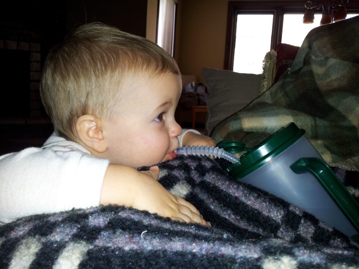 That is all B. We would use a straw very early on and “drop” water into his mouth when out at restaurants. And I don’t know if you knew this, but Matthew was on a sippy cup at 4 months because he decided to refuse bottles – so he’s always been ahead on these things. So anyway, B really kept pushing the straw thing and just kep re-presenting it and he got it. They make straw cups that work upside down too – maybe that’s a way to teach them?