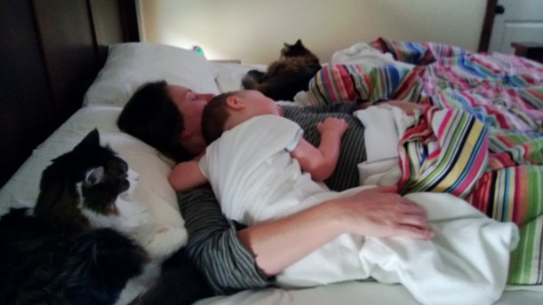 As everyone knows, we watch a little “Curi.ous Geo.rge” every morning together as a family. Matthew usually dances to the opening credits, drinks his milk, and then gets off the bed to cruise around and play with his toys in our bedroom. Today – he snuggled. Today – he watched an entire episode (consists of two short stories) like this: