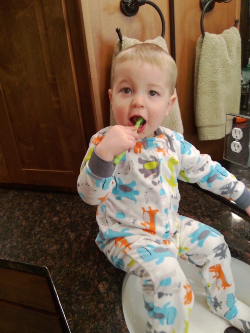 He does look like such a big boy here brushing his teeth!! 🙂 Alidia has been good about letting us brush hers so far but already prefers the end when I let her take the brush herself, although she mostly just chews on it now. Still good to get her started early though 🙂