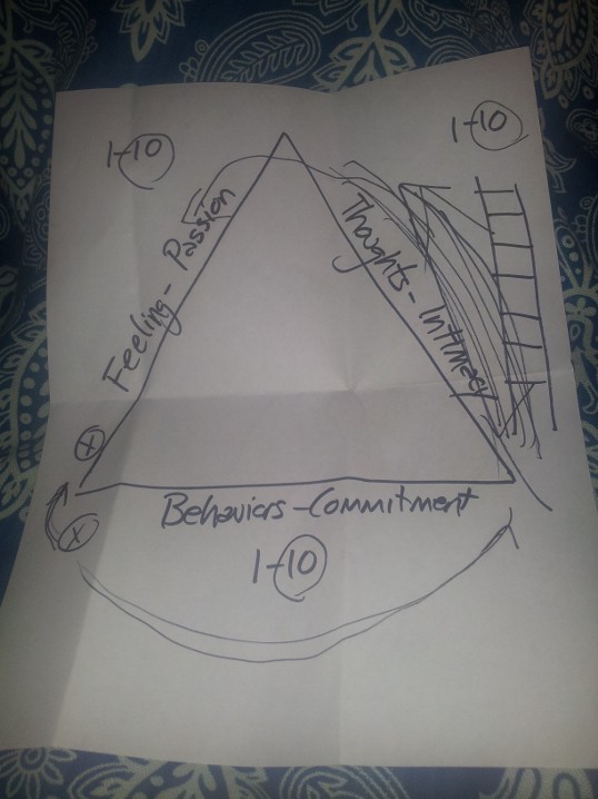 What you need to do when you get back to the lower left point of the triangle is turn around, and go counter-clockwise backwards. In other words, you need to focus on thoughts and intimacy to reconnect with one another. Once you’ve done this (and this is VERY hard to do because you’ve heard each others’ stories, you’ve created stories together, etc.), then the “passion and feeling” will return and it will be wonderful and easy. Working your way UP the thoughts/intimacy side of the triangle is truly an upward climb (hence the ladder in the photo) and takes a lot of work – it takes a LOT of reconnecting.