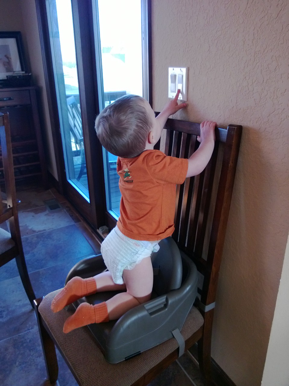 I turned away for just a moment, and next thing I knew, the chair was pushed over to the light switch and the games had begun!