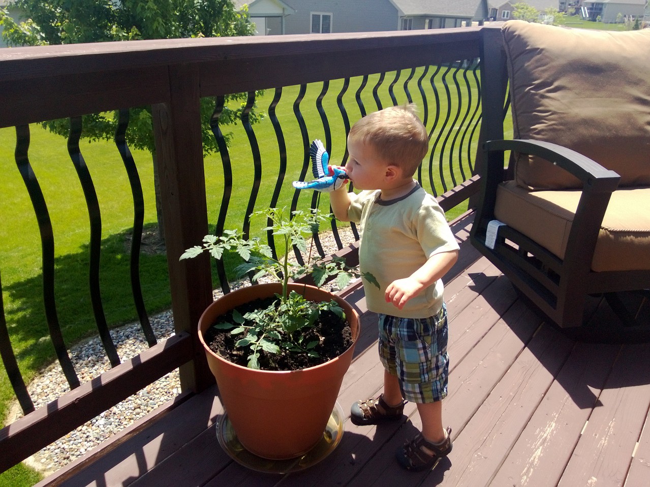 Matthew kisses everything he loves, including his bird friend who keeps his tomato plant company!