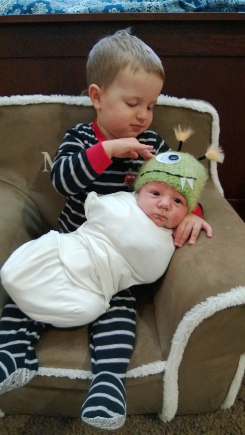 Matthew loves holding Bryson. He asks to hold him many times each day by sitting down, spreading his legs, and tapping the space between his knees. I’m not one to restrict access to the baby, because I think Matthew needs to have the freedom to explore and get to know his brother. So I always say yes, and let him hold Bryson all on his own. So far, the baby has not been tossed… Not yet, anyway!