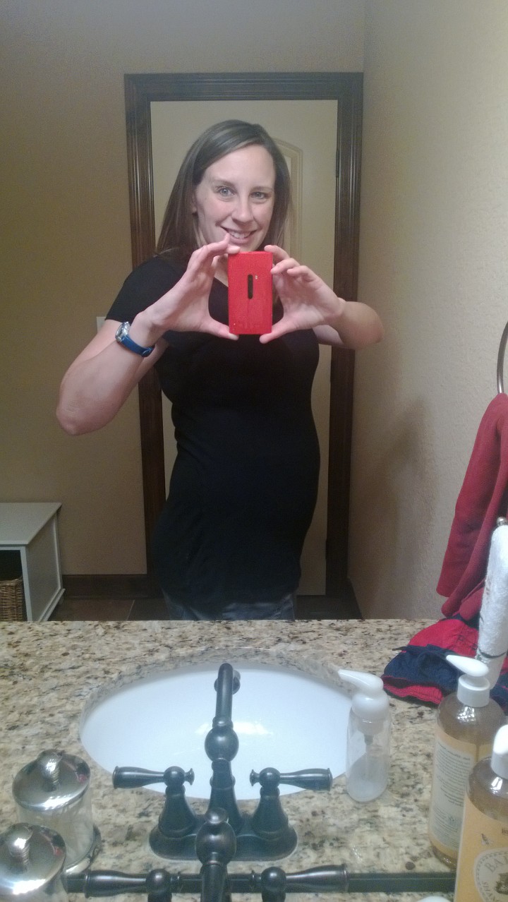 Here I am today, still 8 pounds to go, but I think I look a bit better. HA! (In all fairness, those are two different bathrooms so maybe that’s why I look better today than I did then! Come to think of it though, I’m sure it’s because my uterus wasn’t fully shrunk back to normal in the first photo. HA!)