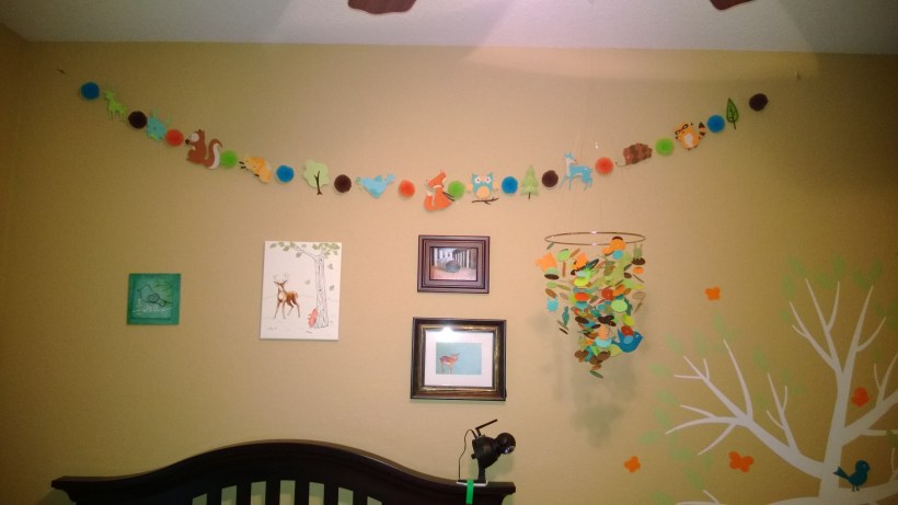 Bryson is in the nursery now and I really wanted to make the room his own, and not just a hand-me-down from Matthew. I hung the mobile last week, and I just finished the garland I made with the animals from his centerpieces and the pom pom cupcake toppers.
