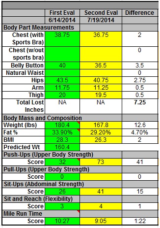 Today was 5-week testing.  I’m down 4.7% body fat and 12.8 pounds.  The second 5 weeks are usually more effective, especially for women, so I’m hoping to at least double those numbers by 10 weeks.  I know I can do it.  We’re going strict Paleo in this house on Monday for the remaining 5 weeks and that should really melt the pounds off.  I’m super excited!