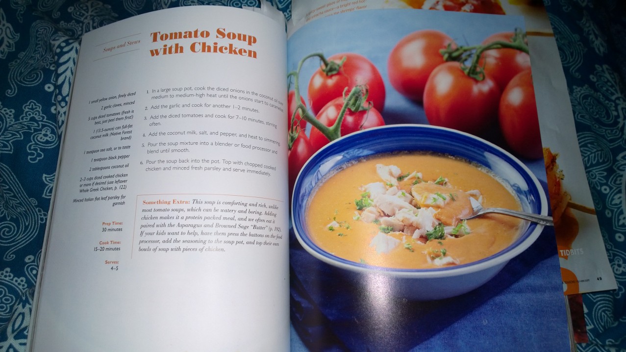 I made tomato soup and it was pretty good – but required some doctoring.  We added cayenne pepper, dried basil, and Bavarian seasoning to it.  I put a bit too much garlic in it.  I did not puree the soup long enough and it was chunkier than we’d normally prefer, but still good.  I used shredded rotisserie chicken as a topping – I felt no need to make my own chicken.