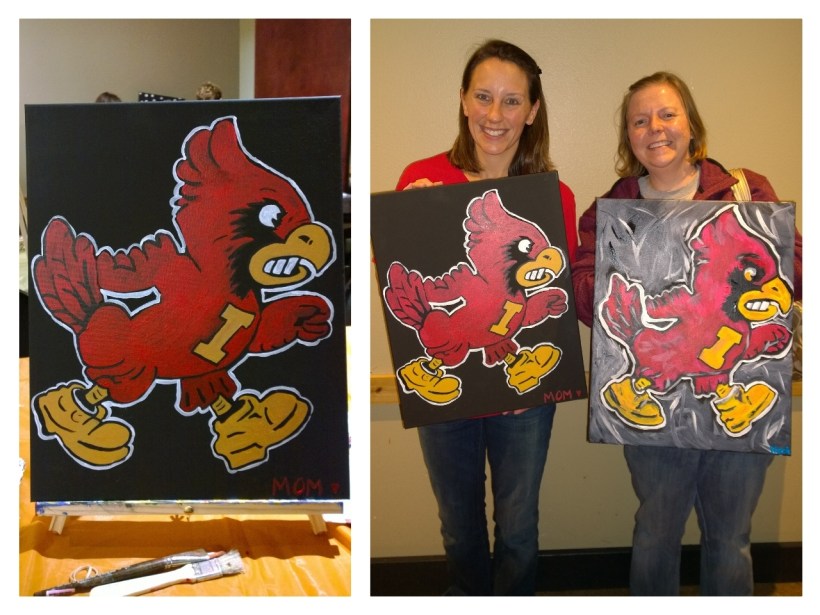 Matthew loves all sports and has quickly latched onto the two big Iowa teams. Iowa is his all-time favorite, but Iowa State is right behind the Hawkeyes. I went to Iowa, Hottie went to Iowa State. Because I furnish their rooms, he has a couple of Hawkeye decorations up that are quite bold and noticeable. But being the good Iowa girl that I am, I support all Iowa teams and only cheer against Iowa State when they play the Hawkeyes and honestly, I could care less who actually wins that game every year. So, it was time for some Cyclone power in Matthews room so I went to a painting session tonight to take care of that.