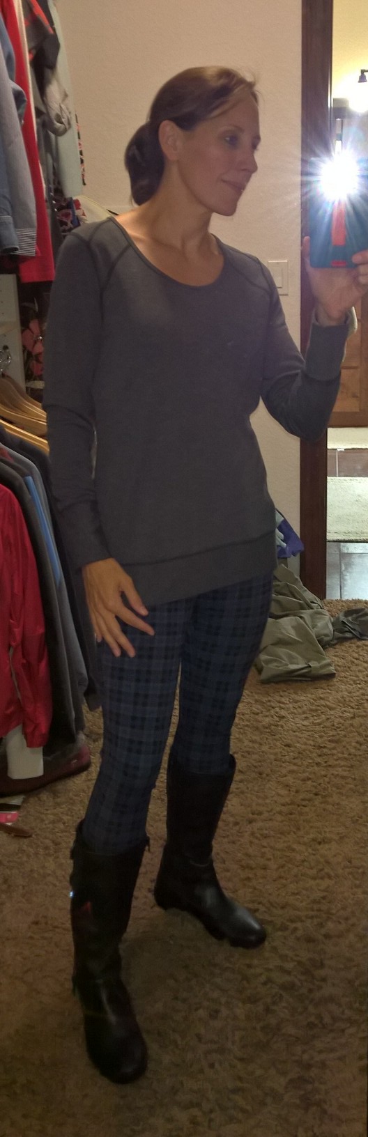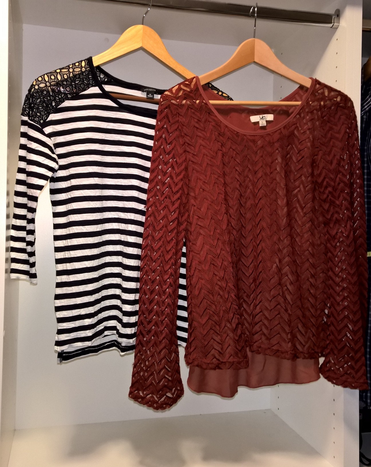 I love the black dress top – worn with the leggings on the shelf there. The red top hasn’t been worn in 2 years – but I like it.
