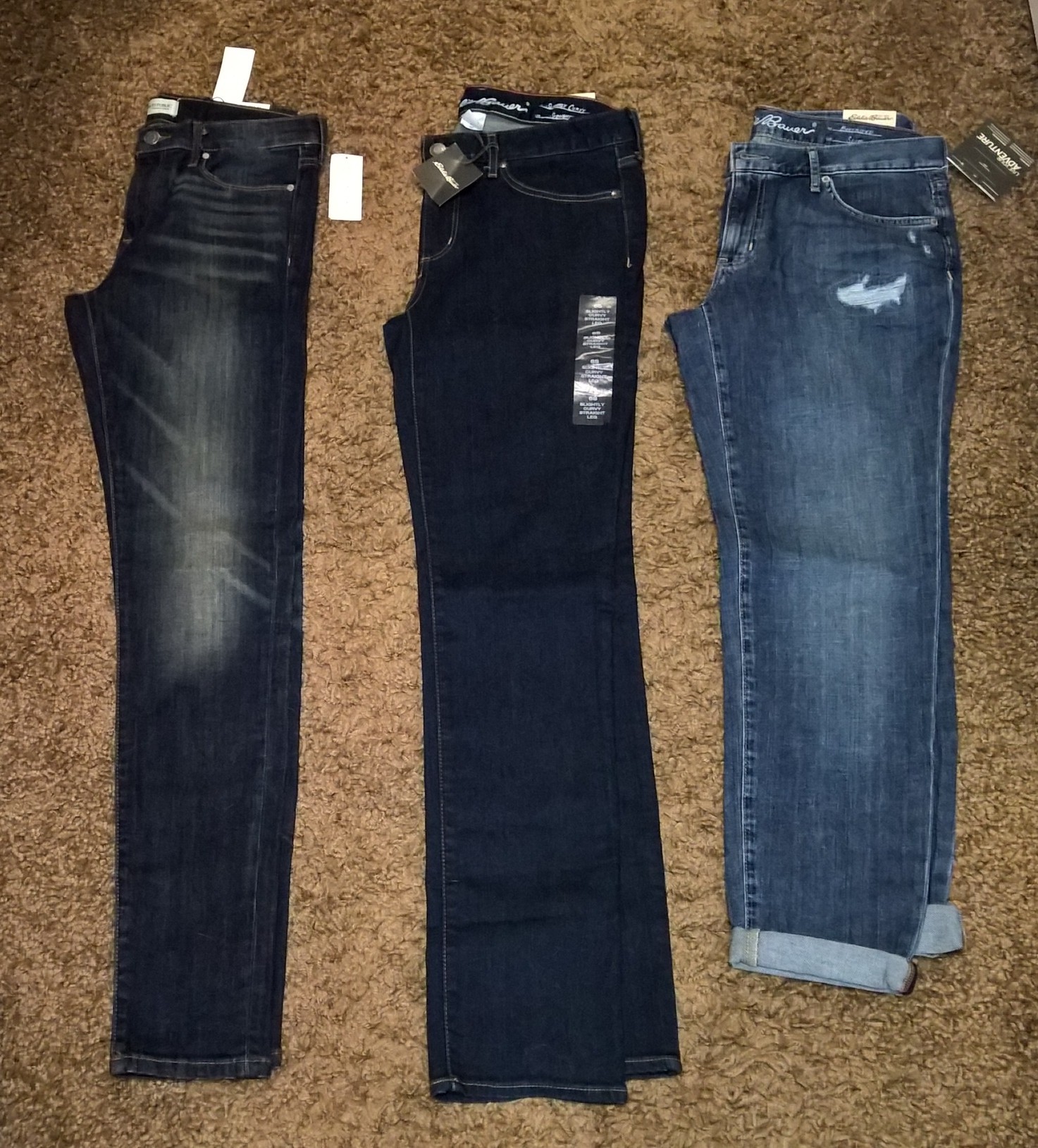 Left to Right: Bana.ana Re.public Washed Indigo Skinny (size 28), Edd.ie Bau.er Slightly Curvy Bootcut (size 6 short), Ed.die Ba.uer Destroyed Boyfriend Slim (size 4)