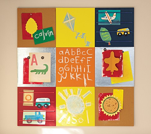 5/13 – What a productive day! I put the bedside bookshelf together today and picked out some fun display boards for photos and crafts. B bought me a polaroid printer for Mother’s Day and said that it will be fun to print pictures for Matthew, and that we should put them on a board in his room. That’s all it took for me to start looking for the perfect thing! I found it at Pottery Barn Kids, of course! I did search high and low – Esty, Amazon, Land of Nod, PBK, etc. My dad gave each of the spouses money to buy a Mother’s Day gift for each of his daughters, so we spent the money on these. I love them! I got the top right blue bungee board, the bottom left red bungee board, and two silver magnetic boards.