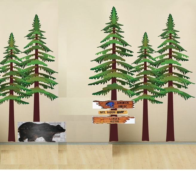 The trees are fabric wall decals (The gal who makes these is enlarging them to have the tallest tree be 7 feet tall), the signs will be customized to say “CURIOSITY CREEK” pointing left, “ADVENTURE PASS,” and “CANOES” pointing right with a canoe hand-painted on it – and the signs will be nailed/screwed onto the big tree. The bear is a wood cut-out and will be attached to the wall. I think we’ll add him last once we know for sure if he’s in proportion with the trees and signs. We really want to add some depth to the room. We LOVE our nursery, but it is a bit “flat.”