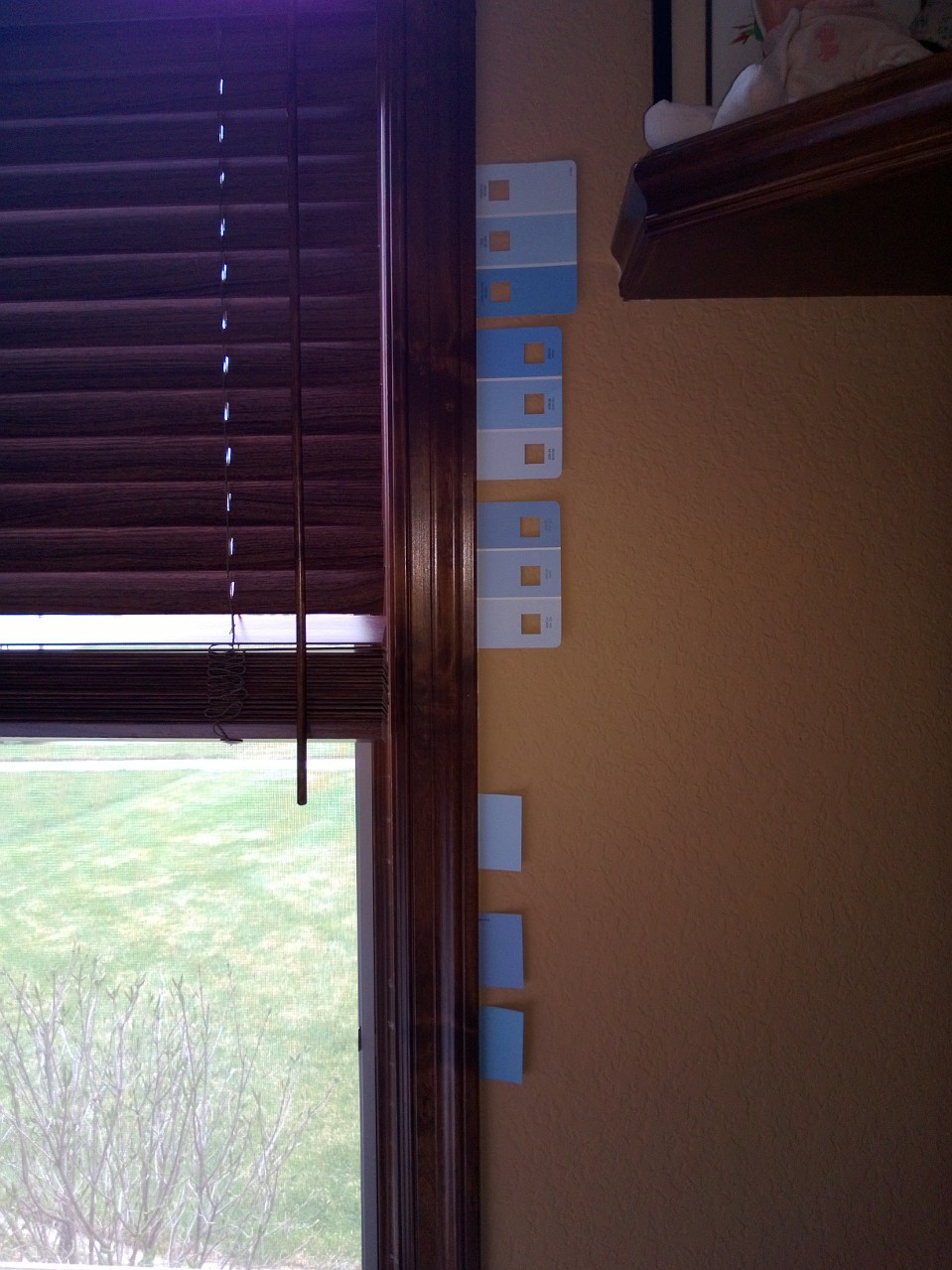 B has agreed to paint the walls a nice light blue. Our entire house is brown and khaki – and it’s time to make some much-needed changes! I picked out paint samples and will get an estimate for the work this week (04/30/2013).