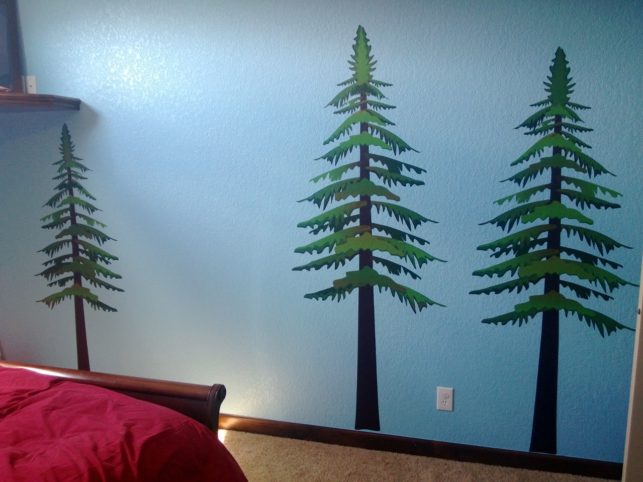 5/7 – I got the old bedding (so much old bedding!) and the mirror out of the room, and setup the quilt and sham. It looks great and even B loves it! The down duvet is in a red cover and on the bed too, and it looks so cozy. Getting the quilt on the bed helped me realize I need a shade deeper of blue for the walls, so I will pick that paint up tomorrow. Things are coming together… Oh! And my decals have shipped! That was fast!